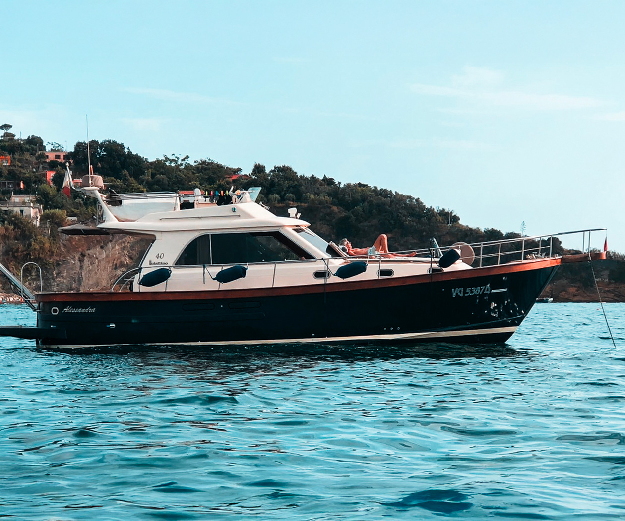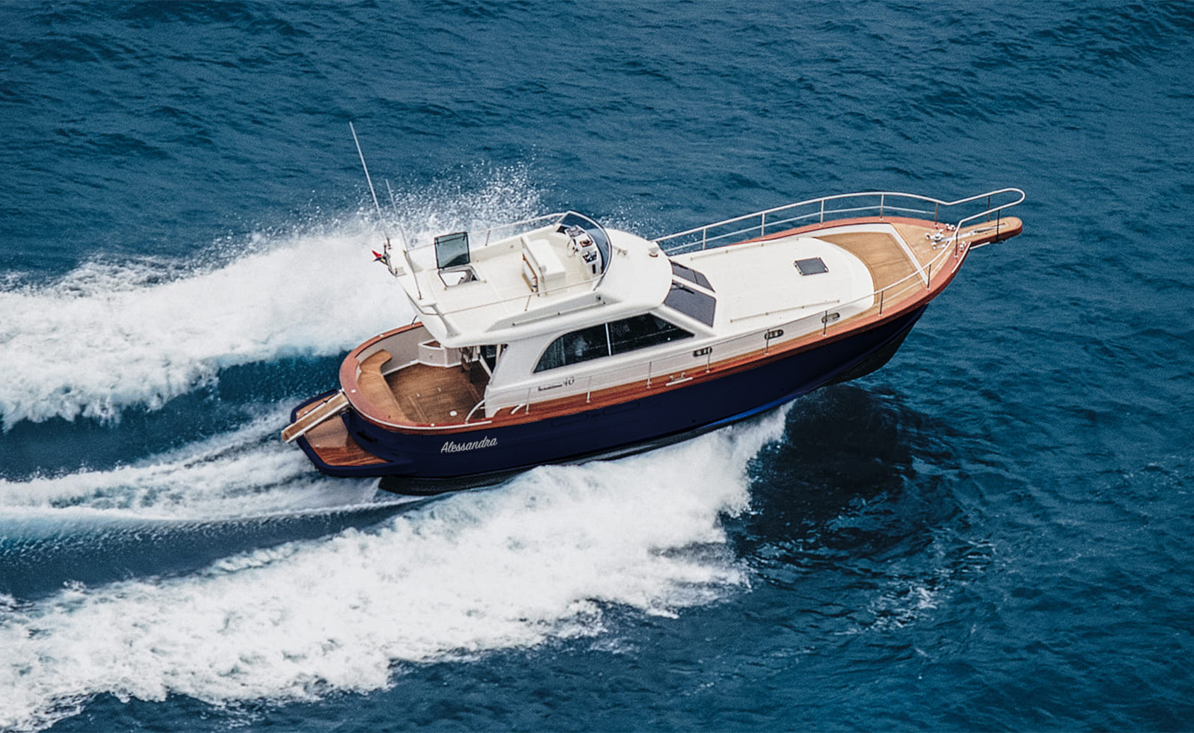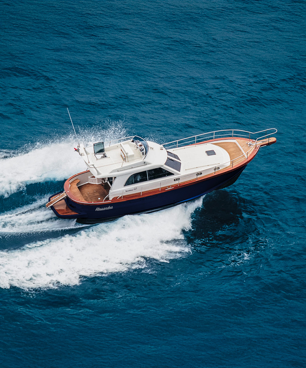 Alessandra è un’imbarcazione di 12 metri perfetta per navigare nel Golfo di Napoli con la coperta in teak e tutta la falchetta in mogano.